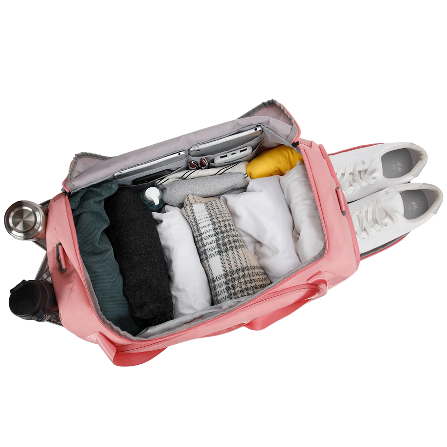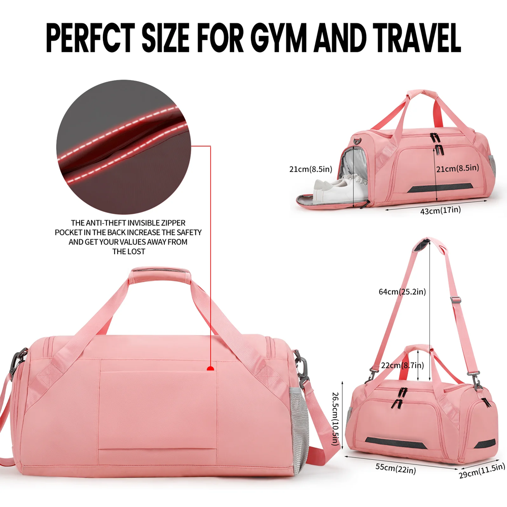 Duffle bag excelente para viajes, color rosa. Incluye compartimiento ideal para zapatos, una manga para sujetar la mochila a la tu maleta de mano y una bolsa anti robos. ¡Ideal para tus vacaciones!