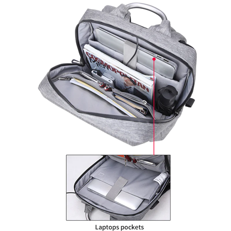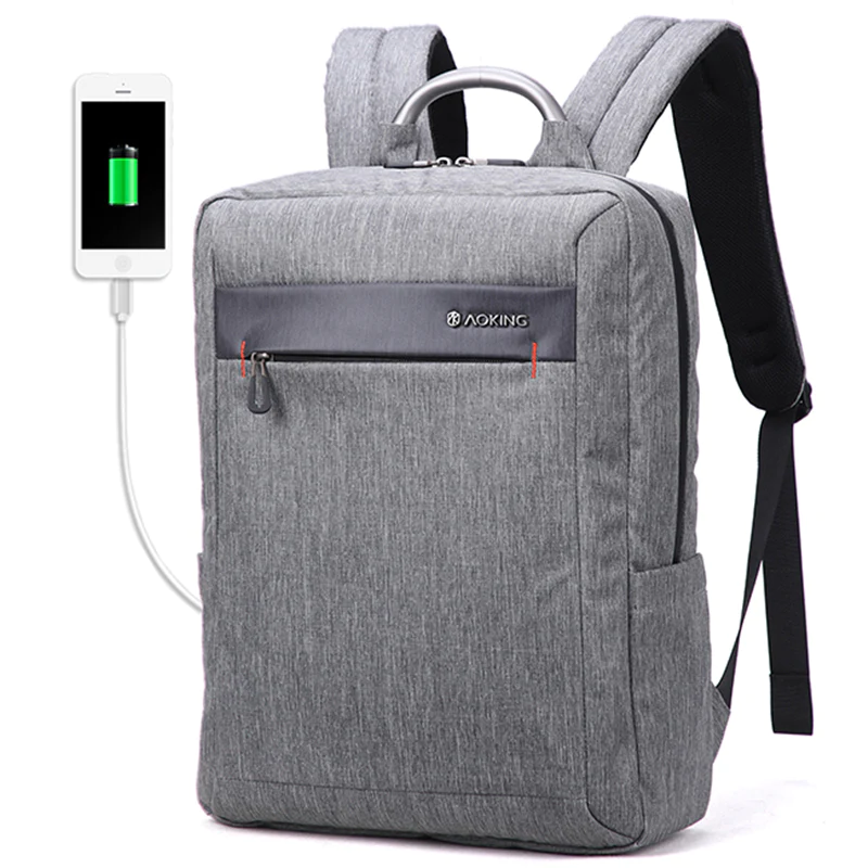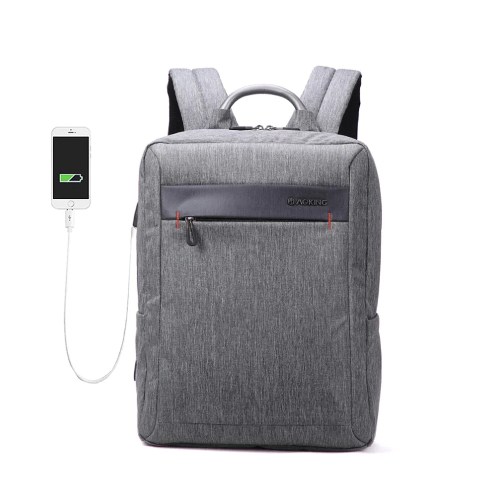 Esta mochila Aoking gris claro posee un compartimiento principal con bolsa para laptop, bolsas para otros items y un puerto USB donde puedes conectar tu power bank para cargar tu celular.