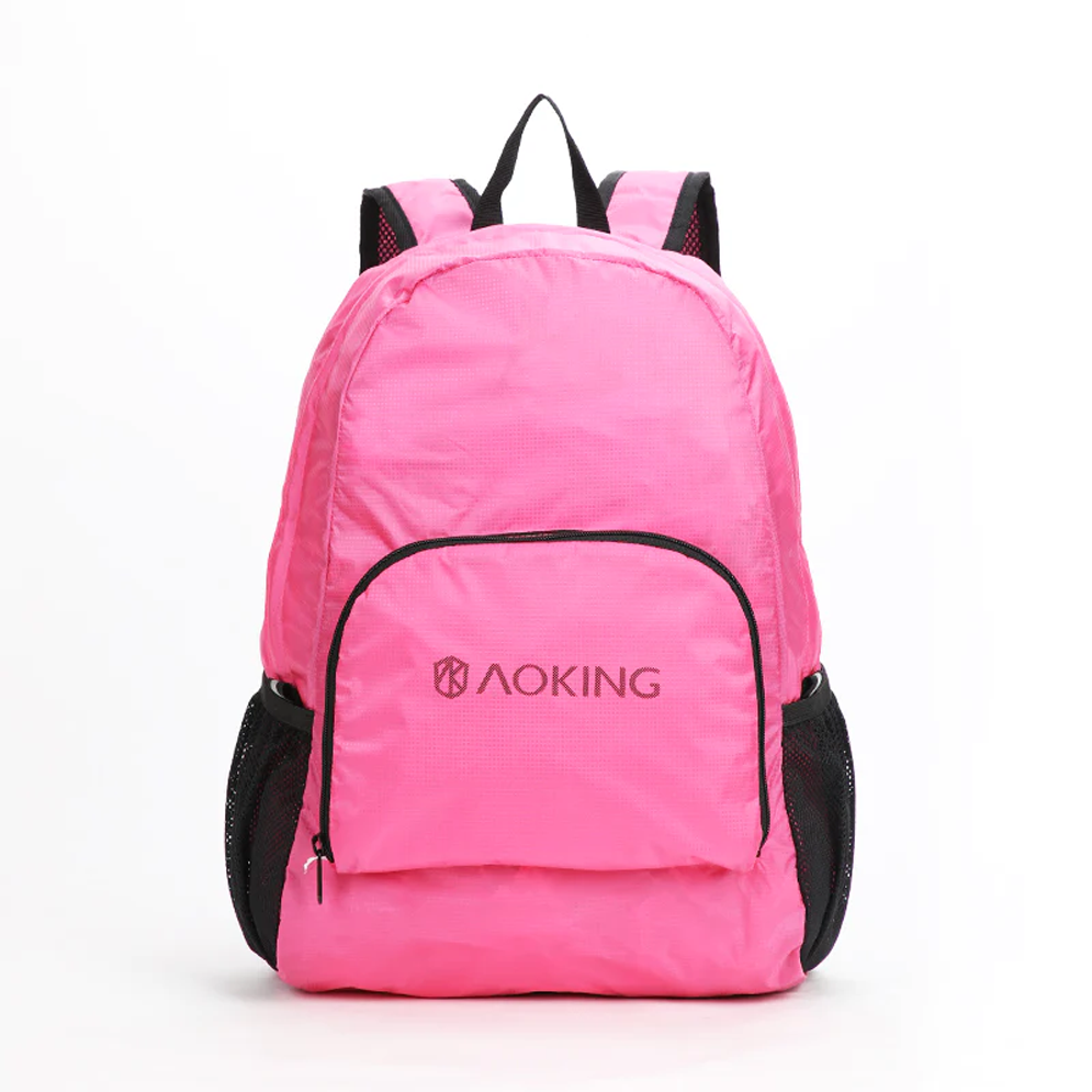 Mochila Aoking color rosado, ligera con un compartimiento principal y un compartimiento frontal. Posee dos bolsas laterales para paraguas o botella.